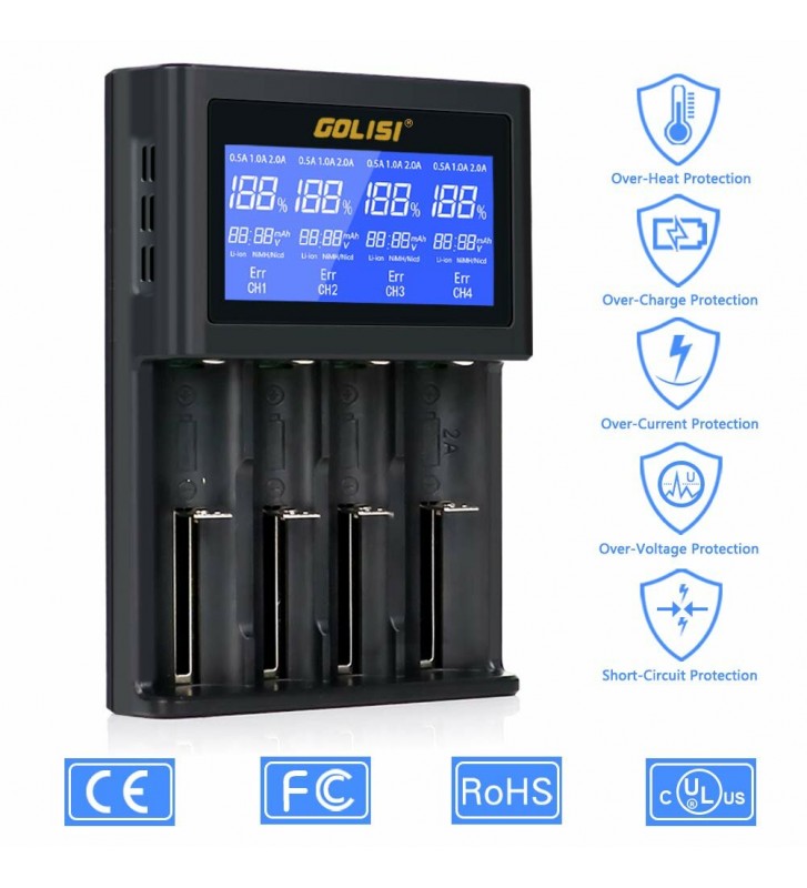 GOLISI i4 LCD Screen Display USB Charging Intelligent 2A Fast Battery Charger Li-ion NIMH Batteries