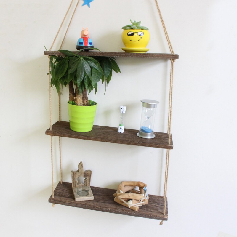 Wooden Wall Storage Rack Rope Hanging Plant Flower Pot Shelf Home Decor